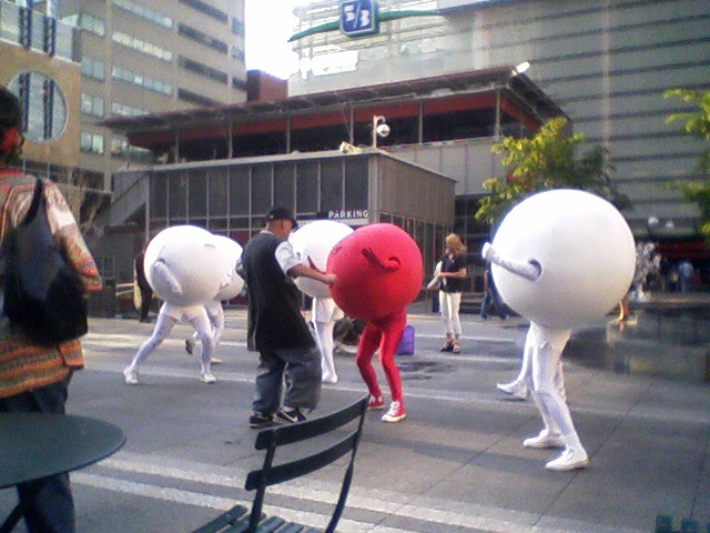 Yessire. Right there on the plaza the afore-mentioned performers (now clad as living PowerBalls) began to dance to the hit tune I’ve Got The Power. Dozens of bystanders rushed to join the fun. You can see the gentleman in the hat was having a blast dancing with the red PowerBall. They do-sa-do’d in style while the music lasted. Then, just as quick as the party started, it was over. The crowd dispersed and the afternoon went on.