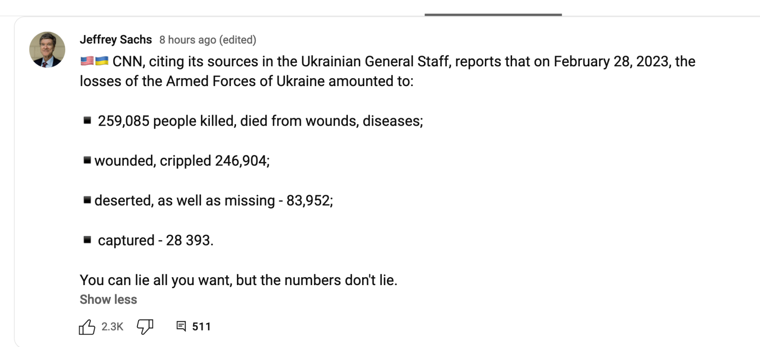 260,000 KIA Ukrainian men. This likely does not include all the NATO ringers, and certainly not the civilian toll. Their blood is on the wicked little hands of the likes of Vicky Nuland, John McCain (BIH), and Joe Brandon. It’s staggering. And still, they keep it going.