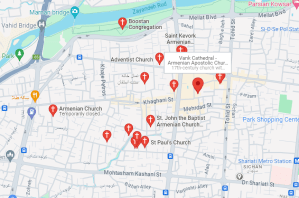 As for Iran in general, the MSM, airhead pundits, and so many political rodents tell us horrific tall tales about Iran. Squeaker of the House, Mikey Johnson (R-hell), says Iran is part of the new “Axis of Evil” along with Russia and China. I remind one and all that, statistically insignificant outlier exceptions aside, there are only two kinds of Republicans. Their two primary archetypes frequently overlap, say, when projecting about an axis of evil. That faux axis appears the opposite of evil, as noted recently by Russia’s Mufti Anar Ramazanov, in an interview with IRNA: “Russian Muslims and Christians are now fighting together against the forces of Satan…” The people fighting for the other side keep telling us lies, such as that Iran is a religiously intolerant country. That, I suppose, is why Yara is virtually surrounded by Churches. Yara’s the little dot on Dr. Shariati St., bottom-right, on the following map.