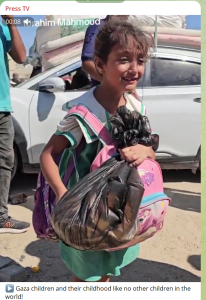 I imagine she’s carrying everything she owns in those two backpacks and the plastic bag. Some of the items might belong to other family members. If she has any left. Odds are, an immediate family member (or two, or all of them) has been Martyred since last October. Odds are, she witnessed the death(s). Her odds of surviving the year are not good. To date, you, complicit Amerikan, and the Zionists have killed a known 20,000 Gaza children. It’s possible the real number is closer to 100,000. This little girl hasn’t been in school, Mosque or Church, or a real bed for nearly a year. She doesn’t eat much or have clean water. She’s trapped in a toxic wasteland the size of Manhattan. No dentist, no doctor, no help. But she has done the jump-and-run routine between bombing zones 3 or 4 times. That’s why she’s out in the street, moving along with everyone else. They’re dodging US-made bombs dropped from US-made warplanes in a US-funded genocide. Again. None of this is her fault and her understanding of the background matters is probably muddled at best. She is, however, keenly aware of her suffering. And, terrified by it all, she does what a little child does: she cries.