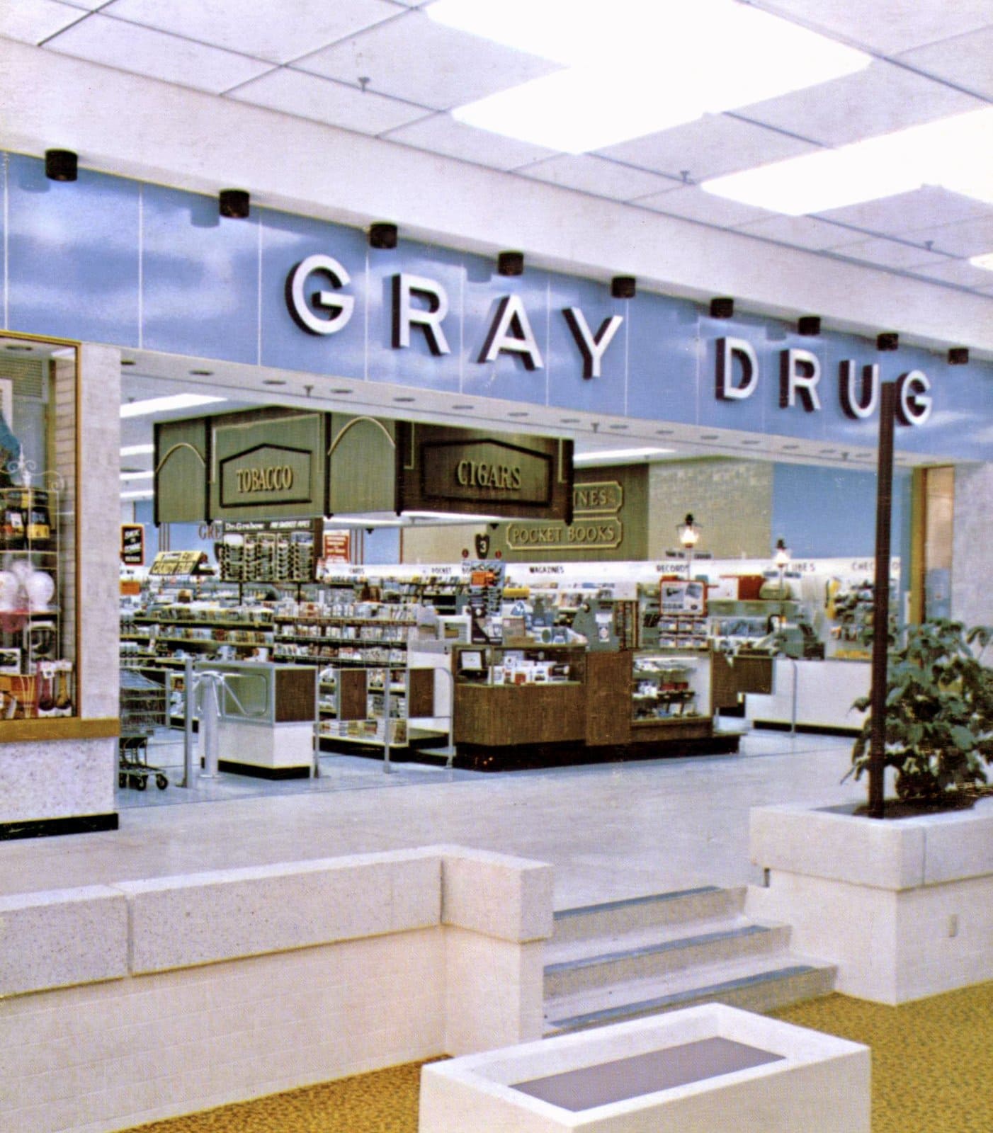 A Gray Drug facade in some American mall in 1969. The look from the days of Peak America: clean, modern, and without so much gaudy flash as developed near the end of the century. In the center of the photo, one can plainly see the large “Tobacco—Cigars” awning hanging over an aisle shelf and display case. A closer inspection reveals that the cigars, cigarettes, pipes, and accessories are open and available on the shelf. One could just walk right up, select some cigars—El Producto, Dutch Masters, Garcia y Vega, King Edward, Muriels—and buy them like any other product. One could smoke in the mall, there were no idiotic identification checks, and prices were affordable (10 to 25 cents in most cases). This was, kids, before Americans gave away their freedoms.