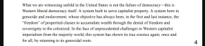 The two primary foreign projects at the moment are in Ukraine (with ~1.7 million dead Ukrainian soldiers alone) and Gaza (~400-600,000 dead, as estimated by outside academic groups). Survivors of other recent wars and genocides have almost unanimously described what is happening in Gaza as far worse than what anyone else has experienced. There are three reasons for that: 1) the extreme disparity between Hamas and the Occupiers backed by their superpower pet; 2) the fact Gazans are locked in a damned cage with no escape; and, 3) the whole world is watching, for the first time in high definition, and doing little to nothing. There is a scene early in The Thorn and the Carnation where several families take refuge in a makeshift bunker during the 1967 Setback. Their trauma is limited, non-lethal, and over in a few days. Imagine it being unlimited, overly lethal, and unending. Thanks to thousands of pictures and videos flooding Telegram, one need not imagine.